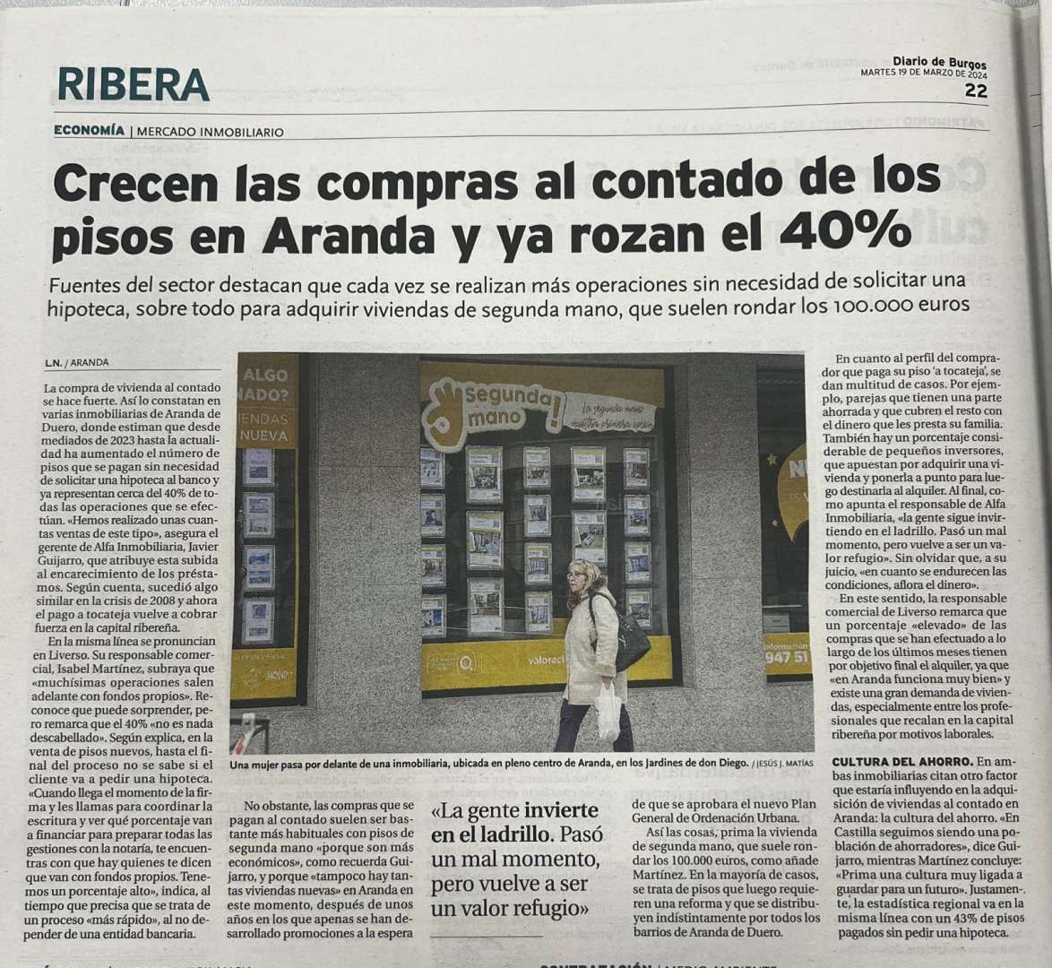 La compra de vivienda al contado se hace fuerte. Así lo constatan varias inmobiliarias de Aranda de Duero, donde estiman que desde mediados de 2023 hasta la actualidad ha aumentado el número de pisos que se pagan sin necesidad de solicitar una hipoteca al banco y ya representan cerca del 40% de todas las operaciones que se efectúan. "Hemos realizado unas cuantas ventas de este tipo", asegura el gerente de Alfa Inmobiliaria, Javier Guijarro, que atribuye esta subida al encarecimiento de los préstamos. Según cuenta, sucedió algo similar en la crisis de 2008 y ahora el pago al contado vuelve a cobrar fuerza en la capital ribereña.